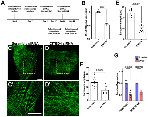Fig. 6 CITED4 is required for hiPSC-derived CM maturation. (A) Experimental timeline. (B) qPCR analysis for CITED4 expression in hiPSC-CMs following treatment with CITED4 siRNA or scramble control siRNA. (C-D′) ACTN2-eGFP hiPSC-CMs following treatment with scramble control (C,C′) or CITED4 (D,D′). Magnification of dashed boxed areas below show sarcomere structure based on ACTN2-GFP expression. (E,F) Quantification of sarcomere length in hiPSC-CMs at day 17 (E) and day 22 (F) following treatment with CITED4 siRNA or scramble control siRNA. (G) Gene expression ratios between TNNI3/TNNI1 and MYH7/MYH6 measured by qPCR in hiPSC-CMs following treatment with CITED4 siRNA or scramble control siRNA. Data are mean±s.e.m. Unpaired two-tailed t-test. Scale bars: 20 µm.