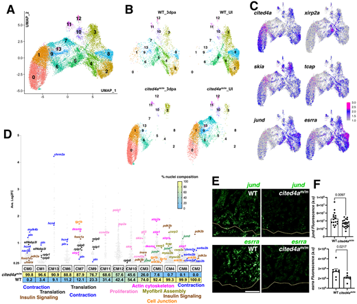 Fig. 8 Second level reclustering and integration of CMs in cited4m/m and WT hearts show distinct CM populations that are not shared. (A,B) UMAP visualization of reclustered CM (A) and split into each condition and genotype (B). (C) Feature plot of gene expression in the CM clusters. (D) Gene expression plot by average log2 fold change in each CM cluster. Each dot represents a single gene, with percentage of nuclei composition for each genotype listed below. (E,F) Representative images of jund and esrra transcripts detected by RNAscope accompanied with graphs showing fluorescent intensity measurements in WT and cited4am/m ventricles at 3 dpa. Data are mean±s.e.m. Unpaired two-tailed t-test. Yellow line in E indicates amputation plane. Fluorescent intensity of RNAscope in F in arbitrary units (a.u.). For jund WT n=4; cited4am/m n=5. For esrra n=4 for each condition. Each dot represents measurements from a single 14 µm section. Four sections per heart for jund, two sections per heart for esrra. Scale bar: 100 µm.