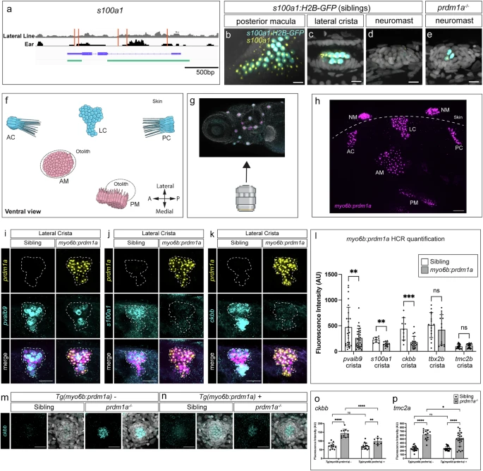 Fig. 3 prdm1a regulates the expression of target genes in the ear. a Schematic of the s100a1 locus showing lateral line (gray) or ear (black) ATAC-seq reads with location of Prdm1 binding motifs in red. Exons and introns in purple. Cloned enhancer-promoter fusion of Tg(s100a1:H2B-EGFP) in green. s100a1 HCR (yellow) and H2B-GFP expression (cyan) in 5 dpf wild type embryos driven by Tg(s100a1:H2B-EGFP) in the posterior macula (b) and lateral crista (c). 5 dpf sibling neuromast (d) and prdm1a-/- dorsal neuromast (e). Scale bars= 10 µm. Representative images of two independent experiments. f Illustration of the zebrafish ear from a ventral view and orientation of the larva during imaging. AC anterior crista, LC lateral crista, PC posterior crista, AM anterior macula, PM posterior macula, NM neuromast. Ventral view of the zebrafish ear. Created in BioRender. Piotrowski, T. (2025) https://BioRender.com/vl2w553 (g), HCR with a prdm1a probe (magenta) in a Tg(myo6b:prdm1a) larva (h). Generated using Biorender. Representative images of six independent experiments. Scale bars= 20 µm (i–k) HCR signals for prdm1a (yellow), pvalb9, s100a1, and ckbb (cyan) in the lateral crista of sibling and the Tg(myo6:prdm1a; cryaa:mTurqoise2) embryos, respectively. Scale bars= 10 µm. Images are representative of embryos from two independent experiments. l Quantification of fluorescent signal from HCRs of pvalb9 (p = 0.0081), s100a1 (p = 0.0018), ckbb (p = 0.0003), tbx2b (p = 0.3699), and tmc2b (p = 0.2497). n = 8 embryos (two ears each) imaged per probe and genotype. Multiple unpaired two-sided t-test, ns>0.05, **p < 0.01, ***p < 0.001. Data are presented as mean ± SD. m HCRs of ckbb in sibling and prdm1a mutant neuromasts. Images representative of two independent experiments. n Expression of ckbb in prdm1a-/- hair cells using the Tg(myo6:prdm1a; cryaa:mTurqoise2) line downregulates the expression of ckbb. Scale bars= 10 µm. Images representative of two independent experiments. o Quantification of ckbb expression in the various conditions. n = 12 for sibling, n = 11 for prdm1a-/-, n = 15 for ectopic prdm1a-expressing sibling and n = 8 for ectopic prdm1a-expressing prdm1a-/-. Two-way Anova with Tukey’s multiple comparisons test, *p < 0.05, **p < 0.01(**p = 0.0069), ***p < 0.001, ****p < 0.0001. Data are presented as mean ± SD. p Quantification of tmc2a HCR fluorescence intensity in the various conditions. n = 21 for sibling, n = 12 for prdm1a-/-, n = 23 for ectopic prdm1a-expressing sibling and n = 23 for ectopic prdm1a-expressing prdm1a-/-. Two-way Anova with Tukey’s multiple comparisons test, *p < 0.05(*p = 0.0262), **p < 0.01, ***p < 0.001, ****p < 0.0001. Data are presented as mean ± SD.