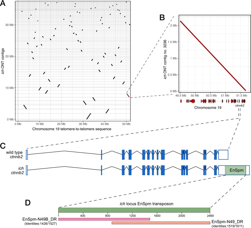 Fig. 1 Long-read sequencing identifies an EnSpm transposon in the 3’UTR of ctnnb2 in ich animals. (A) Dotplot representation of different ich contigs that could be aligned to the “telomere-to-telomere” sequence of the zebrafish chromosome 19. The highlighted (red) contig contains the genomic region of the ctnnb2 gene. (B) Dotplot comparison of the relevant ich contig and the telomeric portion of chromosome 19 reveals no genomic rearrangement in this region in ich animals. Gene position schematics are visible along the horizontal axis. (C) Comparison of wild-type and ich-specific ctnnb2 sequences showing the position of the EnSpm-type transposon insertion. (D) BLAST results of the ich-specific transposon in the FishTEDB [40].