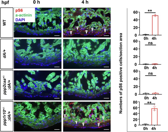 Fig. 6 ppp1r10, but not ppp2caa inhibition, rescues the deregulated nutrient response in dA/+. Representative images and quantification of pS6 in cryosectioned heart tissues of WT, dA/+, ppp2caa+/−; dA/+ and ppp1r10+/−; dA/+ zebrafish mutants at 0/4 h post feeding, co-immunostained using anti-pS6 antibody and anti-α-actinin antibody. a-α−ctinin, green. pS6, red. DAPI, blue. The open arrowheads indicate pS6 signal. pS6 indicates phosphorylated S6 ribosomal protein. Scale bars: 20 μm. One-way ANOVA was used to compare multiple groups. Data are presented as mean ± SEM, three biological replicates, **p < 0.01. WT, wild type, ns, non-significant. (For interpretation of the references to colour in this figure legend, the reader is referred to the web version of this article.)