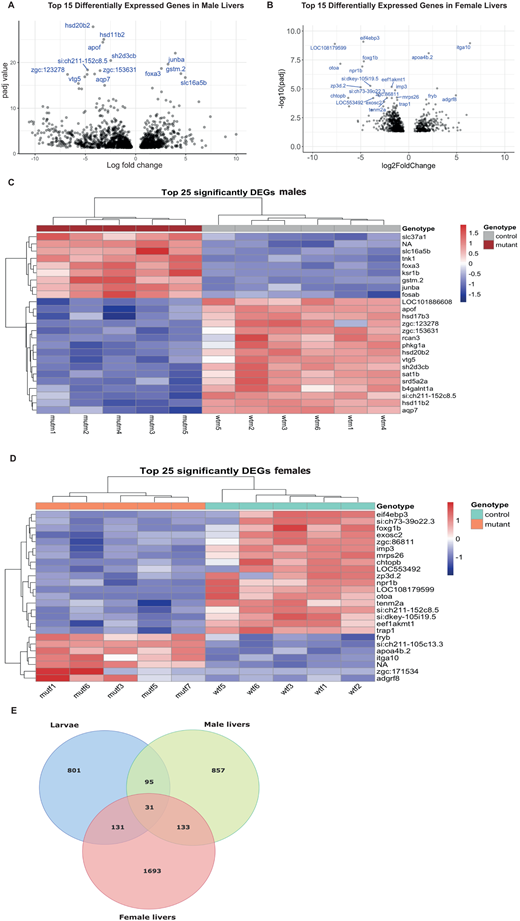 Fig. 3 Differential gene expression in the cyp21a2−/−adult livers. (A,B) Volcano plot showing the top 25 DEGs in mutant livers in males (A) and females (B), with statistical significance (P-adj) represented on the vertical axis and the LFC on the horizontal one. (C,D) Heatmap indicating the top 25 DEGs in mutant livers in males (C) and females (D). (E) Venn diagram showing all the genes that were differentially expressed in mutant larvae (blue), adult male livers (green) and female livers (red), and their overlap between the three groups.