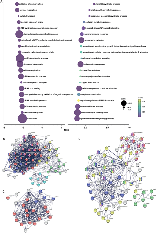 Fig. 5 Gene set enrichment analysis in cyp21a2−/−male livers. (A) The top 20 dysregulated biological processes found by the GSEA. Bubbleplot produced GraphPad Prism showing the 20 most downregulated (left) and upregulated (right) biological processes in cyp21a2 male livers, based exclusively on the NES. The size of the dots indicates the size of the gene set, and the colour corresponds to the q-value, decreasing from yellow to violet. (B-D) Visualisation in STRING of interactions between proteins encoded by genes involved in biological processes (colours of the nodes indicate the main sub-processes to which they belong). (B) ATP metabolism: all oxidative phosphorylation (red, n=29), NADH dehydrogenase (ubiquinone) activity (dark blue, n=12), cytochrome-c oxidase activity (pink, n=12), tricarboxylic acid cycle (yellow, n=9), glycogen metabolism (light blue, n=7) and glycolytic process (green, n=8). (C) Sterol synthesis (red, n=15), proteins with steroid hydroxylase activity (blue, n=4). (D) Immune response and MAPK signalling: immune effector process (pink, n=21), complement activation (red, n=13), inflammatory response (yellow, n=36), cytokine mediated signalling pathway (blue, n=18) and regulation of MAPK cascade (green, n=17).