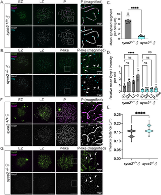 Fig. 2 Loss of Syce2 function results in asynapsed interstitial regions. (A–B) Surface-spread chromosomes from syce2+/+ (A) and syce2-/- (B) spermatocytes imaged using structured illumination microscopy. Proteins are immunostained for Sycp3 (green) and Sycp1 (magenta and gray). Telomeres (cyan) are detected by in-situ hybridization using a fluorescent PNA probe. Examples of spread chromosomes during meiotic prophase I are shown: Early Zygotene (EZ), Late Zygotene (LZ), Pachytene (P) (syce2+/+), and Pachytene-like (P-like) (syce2-/-). Scale bar = 10 µm. Boxed region represents magnified examples of synapsed pachytene (syce2+/+) and pachytene-like (syce2-/-) chromosomes. Scale bar for magnified examples = 2 µm. Arrows represent synapsed-like regions with Sycp1 localization. Double arrowheads indicate Sycp1 localization at unaligned axial regions. (C) Mean synapsed segment per cell (µm) in pachytene and pachytene-like spermatocytes. The mean synapsed segment is significantly lower in syce2-/- spermatocytes (n = 7) compared to syce2+/+ (n = 8). Significance was determined using an unpaired t-test. **** = p < 0.0001. (D) Relative mean Sycp1 intensity per cell from early zygotene to pachytene or pachytene-like spermatocytes normalized to the mean syce2+/+ EZ values. Mean-fluorescence intensity between the axes (n = 25) – mean background (n = 6) was determined for each cell using the segmented-line tool in ImageJ. n = 5, syce2+/+ – EZ; n = 5; syce2+/+ – MZ; n = 4, syce2+/+ – LZ; n = 8, syce2+/+ – P; n = 3, syce2-/- – EZ; n = 6, syce2-/- – MZ; n = 4, syce2-/- – LZ; n = 7, syce2-/- – P-like. Significance was determined using ordinary one-way ANOVA testing with Šidák’s multiple comparisons test. ns = not significant; **** = p < 0.0001. (E) Distance between axes for co-aligned axial pairs in pachytene (n = 126) and pachytene-like (n = 93) spermatocytes from 8 cells in syce2+/+ and 7 cells in syce2-/- shown as a violin plot. Note that one pixel is equal to 0.03 µm resulting in a graph with a bimodal distribution. Significance was determined using an unpaired t-test. **** = p < 0.0001. (F–G) Surface-spread chromosomes from syce2+/+ (F) and syce2-/- (G) oocytes imaged using structured illumination microscopy immunostained for Sycp3 and Sycp1. Examples of spread chromosomes during meiotic prophase I are described in (A–B). Scale bar = 10 µm. Boxed region represents magnified examples of synapsed pachytene and pachytene-like chromosomes. Scale bar for magnified examples = 2 µm. Arrows represent synapsed-like regions with Sycp1 localization. Double arrowhead indicates Sycp1 localization at unaligned axial regions.