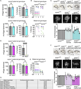 Fig. 4 syce2-/- and sycp1-/- mutants have different reproductive outcomes. (A) Number of eggs spawned and fertilization rate per cross from wild-type and syce2-/- mutants; paternal genotype (top) and maternal genotype (bottom). Each data point represents a cross yielding > 20 eggs from individual animals from three different broods born on different days. Percent fertilized excludes decomposed eggs. Each dot represents an individual animal crossed to AB wild-type fish of the opposite sex. syce2 paternal genotype: Brood 1 (S4461; blue): WT n = 3, MUT n = 6; Brood 2 (S4562, pink): WT n = 2; MUT n = 5; Brood 3 (S4581; green): WT n = 6, MUT n = 6. syce2 maternal genotype: Brood 1 (S4461; blue): WT n = 2, MUT n = 1; Brood 2 (S4562, pink): WT n = 2; MUT n = 2; Brood 3 (S4581; green): WT n = 4, MUT n = 5. Significance was determined using an unpaired t-test for pooled data. ns = not significant. (B) Percent Normal-looking offspring at 1- and 5-days post fertilization (dpf) from wild-type and syce2 mutants from data in (A). Progeny from the syce2 paternal genotype (top) and progeny from the syce2 maternal genotype (bottom). Colored lines represent animals from 3 broods shown as colors in part A. (C) Examples of embryonic progeny of syce2+/+ mothers and normal-looking and malformed embryos from syce2-/- mothers (top). Examples of metaphase chromosome spreads from embryonic cells stained with DAPI isolated from embryos from syce2+/+ mothers and normal-looking and malformed embryos from syce2-/- mothers. The number of chromosomes in the spread is provided as n. Note, the embryos and spreads are independent and are not matched by animal. Quantification of the chromosome content in individual normal-looking (MUT-N) and malformed (MUT-D) offspring. Each column represents an individual embryo; dots represent the number of chromosomes in ten nuclei per embryo. Scale bar = 0.5 mm. (D) Number of eggs spawned and fertilization rate per cross for wild-type and sycp1-/- mutants; paternal genotype (top) and maternal genotype (bottom). Analysis was performed as described in (A). sycp1 paternal genotype includes Broods 2, 3, and 4. Brood 2 (S4297; blue): WT n = 4, MUT n = 3; Brood 3 (S4347; red): WT n = 3; MUT n = 2; Brood 4 (S44434; green): WT n = 2, MUT n = 4.The sycp1 maternal genotype includes Broods 1, 2, and 4. Brood 1 (S3667; purple): WT n = 2, MUT n = 1; Brood 2 (S4297; blue): WT n = 1; MUT n = 1; Brood 4 (S44434; green): WT n = 8, MUT n = 8. Significance was determined using an unpaired t-test for pooled data. ns = not significant.; **** = p < 0.0001. (E) Percent Normal-looking offspring at 1- and 5-days post fertilization (dpf) from wild-type and sycp1 maternal genotype. Colored lines represent animals from 3 broods in part D. (F) Analysis as in part C for progeny of sycp1+/+ and sycp1-/- mothers. (G) Table showing a subset of embryos placed in the nursery from select broods and the percent that survived to adulthood.