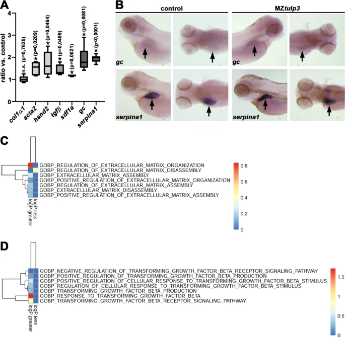 Fig. 6 Loss of Tulp3 results in the upregulation of genes related to fibrosis during zebrafish embryogenesis. (A) qPCR analysis reveals unaltered expression of col1α1 while genes related to liver-fibrosis (acta2, hand2), inflammatory/damage (tgfβ, sdf1a) and liver function (gc, serpina1) were significantly upregulated in MZtulp3 embryos compared to the respective control at 4dpf. (B) WISH analyses indicate upregulated expression of gc and serpina1 in the liver (black arrow) in MZtulp3 embryos compared to the respective control at 4dpf (for each condition a lateral and dorsal view is shown). (C, D) Heatmaps of ECM organization (C) and Tgfβ signalling pathway (D) indicate an increase in related biological processes (GOBP) in MZtulp3 mutant compared to control embryos at 2dpf. Shown are respective up- or downregulated BPs.