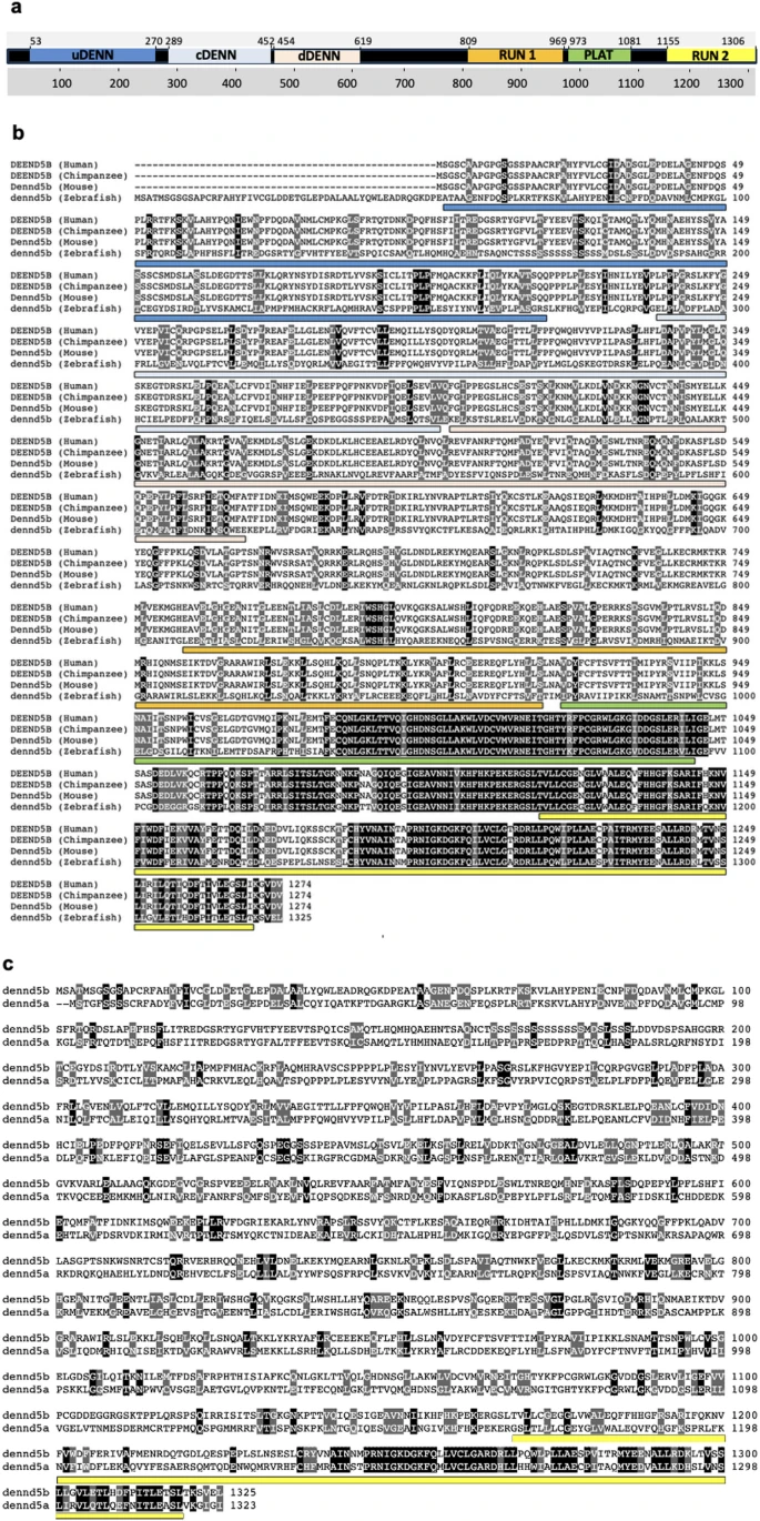 Fig. 1 Multiple sequence alignments of dennd5b amino acid sequences. a The protein domains of zebrafish Dennd5b, including uDENN, cDENN, dDENN, RUN1, PLAT, and RUN2, are illustrated in a schematic representation. The gray line beneath the schematic denotes the positions of the amino acid residues, while the lighter gray line above the schematic marks the specific locations of the individual domains b The amino acid sequence alignment shows the high level of conservation of DENND5B between humans, chimpanzees, mice, and zebrafish. Amino acids highlighted in black shade indicate conservation of the residue between all proteins, those in grey reflect highly similar residues between proteins. Below the amino acid sequences, the blue line represents the position of the uDENN domain, while the light blue lines indicate the central DENN domain. The light pink line corresponds to the dDENN domain. The dark yellow lines denote the locations of the first RUN domain (RUN1), and the light yellow lines mark the second RUN domain (RUN2). Additionally, the green lines represent the PLAT domain, which separates the two RUN domains within DENND5B c Amino acid sequence alignments between zebrafish dennd5a and dennd5b, and light-yellow lines indicate the locations of the RUN2 domain in zebrafish dennd5b