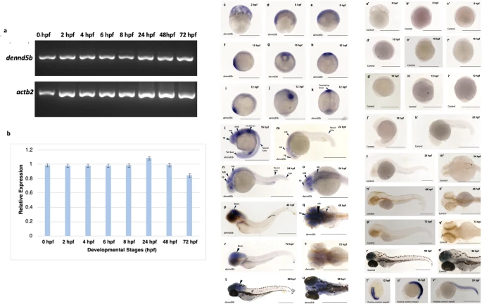 Fig. 2 Temporal and spatial expression of dennd5b during zebrafish embryogenesis. a-b Semi-quantitative RT-PCR analysis of dennd5b expression at 0, 2, 4, 6, 8, 24, 48, and 72 hpf developmental stages. Zebrafish actb2 was used as an internal control for normalization. b Densitometry-based quantification of dennd5b expression levels relative to actb2. Data are normalized to the 24 hpf timepoint and expressed as mean ± SEM from n = 3 replicates. c- v′ Whole-mount in situ hybridization showing dennd5b mRNA expression at various developmental stages. c-e Early development (2–8 hpf). f-h 10 hpf. i-k 7–8 somite stage (12 hpf), expression in developing brain region. l 16 hpf, expression in brain regions including forebrain (FB), midbrain (MB), hindbrain (HB), and developing neural tube and tail bud. m 22 hpf, expression in FB, MB, HB and neural tube. n-o 24 hpf, strong expression in brain regions (HB, MB, FB) with developing neural tube and tail. p-q 48 hpf, prominent brain expression with developing body structures. r-s 72 hpf, continued brain expression in developing larva. t-u 96 hpf, expression maintained in brain regions of free-swimming larva. In situ hybridization of dennd5b with sense probe, which shows no staining. a′ 2 hpf, b′ 6 hpf, c′ 8 hpf, d′-f′ 10 hpf, g′-i′ 12 hpf, j′ 16 hpf, k′ 22 hpf, l′-m′ 24 hpf, n′-o′ 48 hpf, p′-q′ 72 hpf, r′-s′ 96 hpf. t′-v′ Expression of positive control gene myod1 in the somite at 12 hpf, 16 hpf and 24 hpf, respectively. Scale bar 500 μm