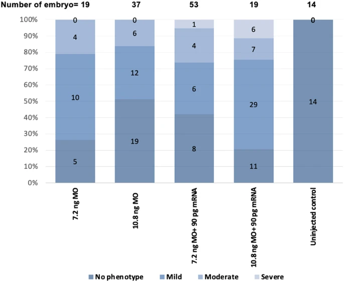 Fig. 5 Graphical representation shows partial rescue of MO dose dependent phenotype by injecting a rescue RNA. A bar graph showing the lower dose of MO and rescue RNA injection leads to a reduction in physical deformities specifically mild to moderate phenotypes as observed at 48 hpf