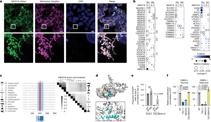 Fig. 2 ABHD18 is a putative mitochondrial serine hydrolase. a, Live-cell fluorescence microscopy of HAP1 cells expressing mNeon-tagged ABHD18 (n = 1). Top, mitochondria are stained with Mitotracker DeepRed (purple) and nuclei with DAPI (blue). Bottom, expanded views of the areas in the white square. Scale bars, 10 μm. b, Dot plots of miniTurbo-tagged (at the amino or carboxy terminus) ABHD18 grown in either glucose or galactose and assessed by BioID (n = 3 biological replicates). AvgSpec, average spectral count. c, Sequence alignment of ABHD18 orthologues from Mycobacterium tuberculosis, Chlamydomonas reinhardtii, Arabidopsis thaliana, Oryza sativa, Caenorhabditis elegans, Ciona intestinalis, Nematostella vectensis, Drosophila melanogaster, Branchiostoma floridae, Danio rerio, Homo sapiens, Pan troglodytes and Xenopus tropicalis (left). The canonical serine hydrolase motif is highlighted in blue, with the conserved serine residue in red. The heatmap shows amino acid sequence similarity between ABHD18 orthologues determined by Clustal Omega (right). Similarity profiles were hierarchically clustered. d, Predicted Alphafold structure of ABHD18 with a putative catalytic site containing a serine residue (red). Exon 8 sequences are highlighted in cyan and the N and C termini are yellow. e, Competitive growth assay of HAP1 cell lines expressing ABHD18(WT)–eGFP or catalytic dead ABHD18(S199A)–eGFP. The indicated lines were co-cultured with HAP1 WT–Cherry and quantified by flow cytometry over 6 days. Bar plots show the eGFP+ proportion normalized to day 0. Data are presented as mean ± s.d. of n = 3 biological replicates, with significance determined by one-way ANOVA followed by Tukey’s multiple-comparisons test. f, Proliferation assay comparing single TAZ-KO (Padj = 0), ABHD18-KO (Padj = 0) and double-mutant TAZ;ABHD18 double-KO (Padj = 0.0109) in GAL effects in glucose-supplemented (left) or galactose-supplemented (right) DMEM, normalized to the WT. Data are presented as mean ± s.d., n = 3 biological replicates. Significance was determined by one-way ANOVA followed by Dunnett’s post-hoc test. Panel d was reproduced from https://alphafold.ebi.ac.uk under a CC-BY 4.0 license.