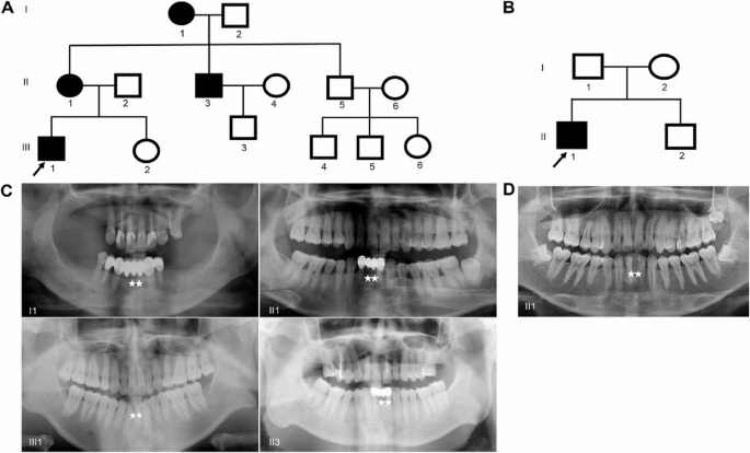 Fig. 1 Pedigree and panoramic radiograph of family 1 (A) and family 2 (B). Males are marked as squares and females as circles. An arrow indicates the proband, and the black symbols indicate the affected individuals. (C-D) Panoramic radiograph of the patients shows all individuals had a congenital absence of mandibular central incisors. An asterisk marks the congenital missing tooth. Notably, Individual I1 has multiple missing teeth due to age, and the proband III1 has undergone orthodontic treatment