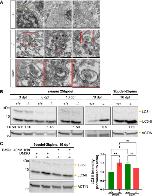 Fig. 5 Homozygous snapin mutants show abnormal accumulation of autophagic vacuoles and progressive larval onset accumulation of autophagosomes (A) Top: TEM images from WT (+/+) fish. Orange arrow, nucleus; light blue, rough endoplasmic reticulum; dark blue, mitochondria. Scale bar: 500 nm. Middle: TEM images from 25bpdel homozygous mutant (−/−) showing abnormal accumulation of double-membrane autophagic vacuolar structures. Red arrow, autophagosome. Scale bar: 500 nm. Bottom: insets show zoomed view of vacuolar structures. Scale bar: 200 nm. (B) Longitudinal LC3 immunoblotting on 25bpdel and 9bpdel-2bpins mutants. +/+, WT; −/−, homozygous mutant. (C) LC3 immunoblotting using 40 nM bafilomycin A1 (BafA1) or DMSO for 16 h prior to harvesting at 10 dpf (+/+, WT; −/−, homozygous mutant; +, reagent present; −, reagent absent). Statistical test: one-way ANOVA followed by Fisher’s least significant difference (LSD) test (ns, nonsignificant, ∗p < 0.05, and ∗∗p < 0.01).