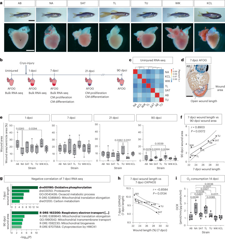 Fig. 1 Differential regenerative response to cryo-injury among wild-type adult zebrafish strains identifies OXPHOS as beneficial for regeneration.