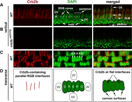 Fig. 2 Crb2b localization in the pentamers of RGB cones in 12-mpf retina. (A) Crb2b immunostaining (red) of radial sections of the wild-type photoreceptor layer. The DAPI staining (green) revealed the differences in staining intensities and positioning among the photoreceptor nuclei: lightly stained and more apical positioned long RGB cone nuclei; lightly stained round UV cone nuclei immediately basal to the outer limiting membrane (OLM, the dashed line in the merged panel); and intensively stained smallest rod nuclei at the basal half of the outer nuclear layer. The dashed line in the green panel indicates the position where pentamers were examined at the transverse plane (see panels C, D). A pentamer, flanked by two UV cones, is indicated by a bracket. In the merged image panel, an RGB cone is contoured to show its general polarized morphologies, with its pedicle, inner segment (IS), and outer segment (OS) indicated by arrows. (B) No Crb2b signals (red) were detected in homozygous crb2bsa21178 mutant retinas (radial section). (C, D) Crb2b immunostaining (red) of a transverse section of the photoreceptor layer revealed that Crb2b localized to the junctional interfaces between RGB cones of pentamers, as depicted by the diagrams in D. Note the lack of Crb2b signals at the adjacent convex cell surfaces.