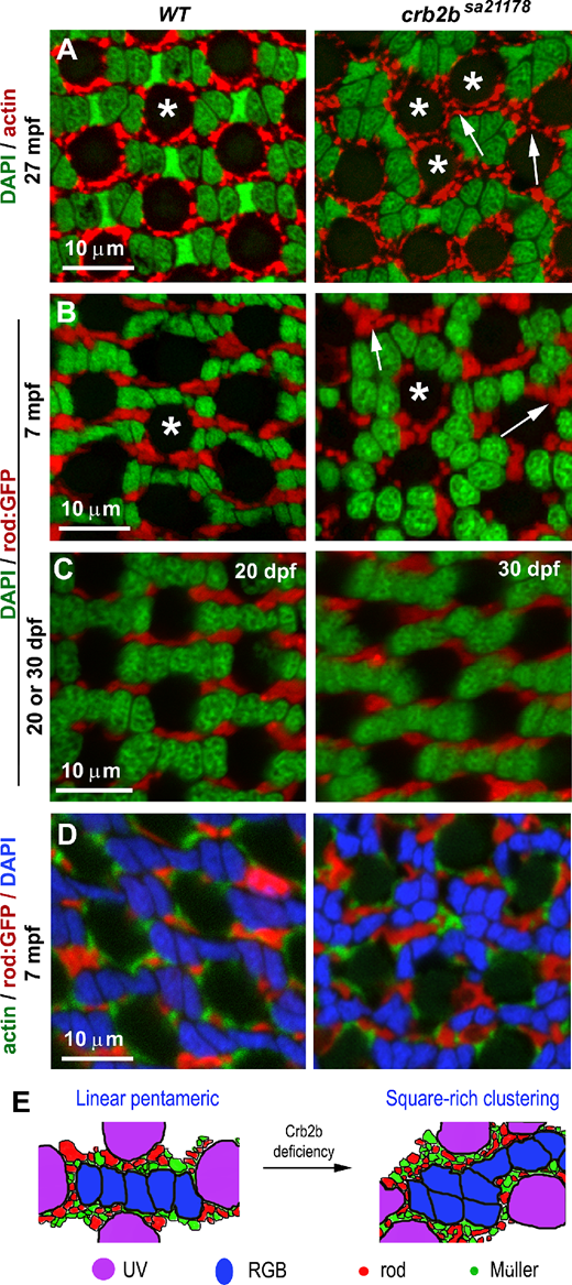 Fig. 5 Crb2b deficiency results in the disorganization of rods, UV cones, and Müller glial cells, as revealed by transverse imaging of the dorsal intermediate retina. (A) Actin staining (red) revealed that the apical processes of Müller glial cells surround UV cones regularly (asterisks) in the wild-type but often form larger clusters in crb2bsa21178 homozygous mutants. (B, C) Rods, revealed by GFP expression (red) in the Tg(-3.7rho:EGFP)kj2 transgenic background,50 formed linear clusters separating individual pentamers in the wild-type. However, they formed larger irregular clusters in the mutants (arrows) at 7 mpf (B) but not at 1 mpf (C). (D) Simultaneous visualization of actin, rods, and nuclei (DAPI staining) revealed that pentameric cone units were surrounded by rods and Müller glial cell processes. (E) Diagrams summarize the differences in the patterning of all photoreceptor types between the wild-type and crb2bsa21178 homozygous mutant retinas (n = 4 fish for each condition).