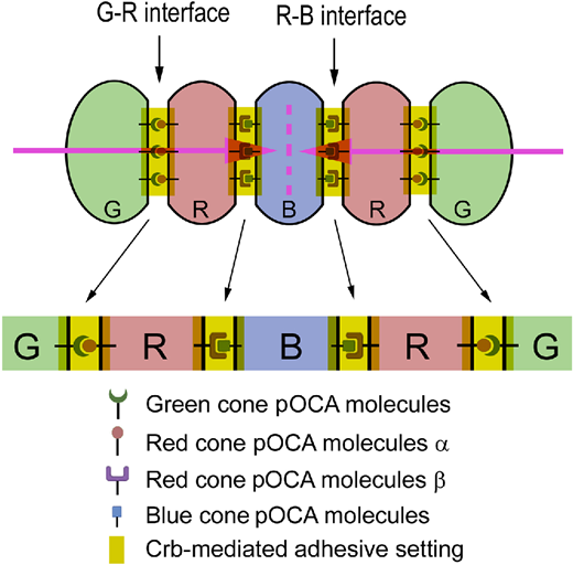 Fig. 7 The Lego self-assembly model for RGB cone pentamer formation and maintenance. Diagrams illustrate the hypothesized planar OCAs (pOCAs) that mediate G–R and R–B coalescence. Each type of RGB cone expresses a unique set of pOCA molecules. Blue-cone-specific pOCA molecules are distributed to two opposing parallel surfaces, where they bind to red-cone-specific pOCA molecules β to recruit two red cones in parallel flanking positions. Red cones also express another set of red-cone-specific pOCA molecules α, which localize opposite the pOCA molecules β and bind to green-cone-specific pOCA molecules, thus recruiting a green cone on the side opposite from the central blue cone. These parallel, anisotropically distributed, and cell-type-specific OCAs ultimately dictate the pentameric configuration. Crb2b localizes to all of these intercellular interfaces to play two roles: First, it assists in general adhesion by augmenting the adhesion between pentamer members; second, it helps to restrict G–R cone-specific pOCAs to the parallel junctional interfaces to prevent them from expanding to other membrane regions, which would result in square aggregation of green and red cones of neighboring pentamers. RGB cones are color coded; various OCA molecules are symbolized with distinct icons. The pink arrows indicate the opposing planar polarity within a pentamer, and the pink dashed line indicates the axis of the mirror symmetry of the planar polarities within a pentamer.