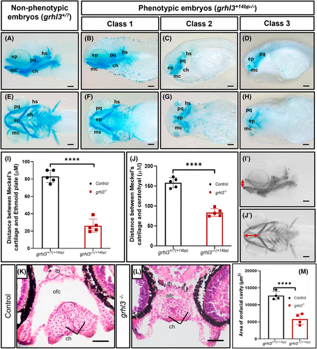 Fig. 4 Craniofacial development in grhl3−/−(+14 bp) embryos at 4 dpf. (A–H) Class 1, class 2, and class 3 grhl3−/−(+14bp) embryos and non-phenotypic siblings (4 dpf) stained with Alcian blue, showing lateral (A–D) and ventral (E–H) views of the craniofacial cartilage (palatoquadrate [pq], ceratohyal [ch] Meckel's cartilage [mc], ethmoid plate [ep], and hyosymplectic [hs]). (I-I') The height between Meckel's cartilage and ethmoid plate (indicated by vertical double-headed red arrow) and (J-J') the distance between Meckel's cartilage and ceratohyal (indicated by horizontal double-headed red arrow) were measured and analyzed in grhl3−/−(+14bp) embryos and non-phenotypic siblings. (K, L) H&E staining of transverse sections across the rostral region of 7 dpf class 1 grhl3−/− mutant and control embryos (ceratohyal [ch] trabecular bar, orofacial cavity [ofc]). (M) Orofacial cavity area of grhl3−/− and control embryos. Data are shown as mean ± SEM; n = 5. Statistical significance determined by Student's t-test ****p <.001. Scale bars: 100 μm (A-J'), 50 μm (K, L).