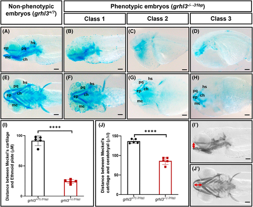 Fig. 5 Craniofacial development in grhl3−/−(−31 bp) embryos at 4 dpf. (A–H) Class 1, class 2, ad class 3 grhl3−/−(−31bp) embryos and non-phenotypic siblings (4 dpf) stained with Alcian blue, showing lateral (A–D) and ventral (E–H) views of the craniofacial cartilage (palatoquadrate [pq], ceratohyal [ch] Meckel's cartilage [mc], ethmoid plate [ep], hyosymplectic [hs]). (I-I') The height between Meckel's cartilage and ethmoid plate (indicated by vertical double-headed red arrow) and (J-J') the distance between Meckel's cartilage and ceratohyal (indicated by horizontal double-headed red arrow) were measured and analyzed in grhl3−/−(−31bp) embryos and non-phenotypic siblings. Data are shown as mean ± SEM; n = 5. Statistical significance determined by Student's t-test ****p <.001. Scale bars: 100 μm (A-J').