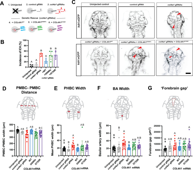Fig. 3 Human wild type COL4A1 mRNA can rescue certain cerebrovascular phenotypes in col4a1 crispants. A. Schematic summarising the injection groups used in mRNA rescue experiments. B. The incidence of ICH was measured as a percentage of the total larvae number. Wildtype zebrafish larvae were uninjected or microinjected with a control gRNA or 4 col4a1 targeting gRNAs to knock down col4a1 expression at the single-cell stage. col4a1 crispants were also co-injected with 30pg WT human COL4A1 mRNA or human pathogenic variants COL4A1G696fs and COL4A1G755R. Data shown is from 5 biological replicates with (n = 25–40). C. Representative images of the cerebral vasculature of Tg(kdrl:EGFP) zebrafish injected with a control gRNA or col4a1 gRNAs or left uninjected. A proportion of col4a1 crispants received an additional injection of either human WT COL4A1 mRNA or the human pathogenic variants COL4A1G696fs and COL4A1G755R. Vascular defects highlighted with a red arrow. The scale bar represents 100 µm. Larvae were dorsally orientated, and maximum intensity projections were presented from light sheet microscopy using a 20x objective and 1x digital zoom. D-G: Manual vascular measurements made of vascular parameters using maximum intensity projections Z-stacks of col4a1 crispants cerebrovasculature on the Tg(kdrl:EGFP) background. Specific measurements calculated include (D) distance between primordial midbrain channels (PMBC) (µm), (E) primordial hindbrain channel (PHBC) width (µm), (F) basilar artery (BA) width (µm) and (G) forebrain space (µm2). For each experimental group, n = 27–30 from three biological replicates, with each larval measurement plotted individually. B & D-H. Data analysed with one way ANOVA and presented as mean ± SD. Asterisks Letters A, B and C are compact letter displays to signify means that are significantly different at the 5 % level using the Tukey HSD test.