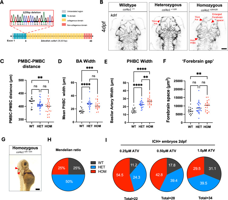 Fig. 5 col4a1Δ20 mutant larvae have a milder neurovascular phenotype than crispants. A. Schematic representing the 20-base pair deletion at the exon 8/intron 8–9 boundary of the zebrafish col4a1 gene B. Representative maximum intensity projections of the developing cerebrovasculature in wildtype (col4a1+/+), heterozygous (col4a1+/Δ20) and homozygous (col4a1Δ20/Δ20) larvae on the Tg(kdrl: EGFP) background at 4 dpf. The zebrafish were live-imaged using light-sheet microscopy in a dorsal orientation with a 20x objective and 0.7x digital zoom. Images are a maximum intensity projection of a z-stack with an inverted greyscale image below. Different individual fish represent each genotype at each time point and the scale bar is 100 µm. Genotyping was performed after image acquisition. Abbreviations: PHBC- primordial hindbrain channel, PrA-porencephalic artery, PMBC- primordial midbrain channel. C. The distance between the left and right PMBC is reduced in col4a1Δ20/Δ20 larvae compared to col4a1+/+ siblings. D. Basilar artery (BA) width is increased in col4a1+/Δ20 and col4a1Δ20/Δ20 compared to wildtype col4a1+/+ siblings. E. The mean width of both PHBCs is increased in col4a1+/Δ20 and col4a1Δ20/Δ20 larvae compared to col4a1+/+ siblings. There is also a difference between col4a1+/Δ20 and col4a1Δ20/Δ20 siblings. F. The area of forebrain space is increased in col4a1Δ20/Δ20 larvae compared to col4a1+/+ siblings. C-F. Vascular measurements were made on maximum intensity projections from Z-stacks using FIJI. The larvae were live-imaged using light-sheet microscopy in a dorsal orientation with a 20x objective and 0.7x digital zoom. Genotyping was performed after image acquisition. n = 18–27 per group over 3 biological replicates with each larvae measurement plotted individually. Data were analysed with a one-way ANOVA. Asterisks signify means that are significantly different at the 5 % level using the Tukey HSD test ns P > 0.05, * P ≤ 0.05, **P ≤ 0.01, *** P ≤ 0.001 and **** P ≤ 0.0001. G. An o-dianisidine-stained col4a1Δ20/Δ20 larva at 3 days post fertilisation showing ICH (red arrows) and a 100 µm scale bar. H. Pie chart to show the expected Mendelian ratio of embryos from a heterozygous incross. I. Embryos from a col4a1+/Δ20 incross were treated with increasing concentrations of atorvastatin (ATV) at 1 dpf. At 2 dpf, embryos were stained with o-dianisidine to isolate ICH+ and ICH- embryos followed by genotyping. The percentage of ICH+ embryos from each genotype is written in white and the total number of ICH+ embryos are written below. Data are from two biological replicates.