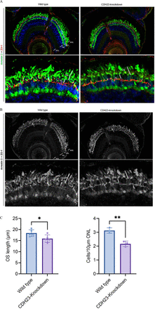 Fig. 5 (A) Compared with wild zebrafish, CDH23-knockdown zebrafish photoreceptors are more sparse, but photoreceptors are more closely connected to each other. Up: Scale bars: 10 mm. Down: Scale bars: 2 mm. (B) Grayscale version of panel A; arrows indicate the connecting structures between the photoreceptors. (C) Effects of CDH23 knockdown on OS length and ONL cell density in zebrafish retinas. Bar graphs present mean OS length (μm) and ONL cell counts (cells/10 µm ONL) for wild type and CDH23- knockdown groups. Sample sizes: n=5 for OS length and n=3 for ONL cell density. Data are expressed as mean±SEM; *p<0.05, **p<0.01 (independent-samples t-test) (Representative images shown). GCL, ganglion cell layer; INL, inner nuclear layer; IS, inner segment; ONL, outer nuclear layer; OS, outer segment; RPE, retinal pigment epithelium.