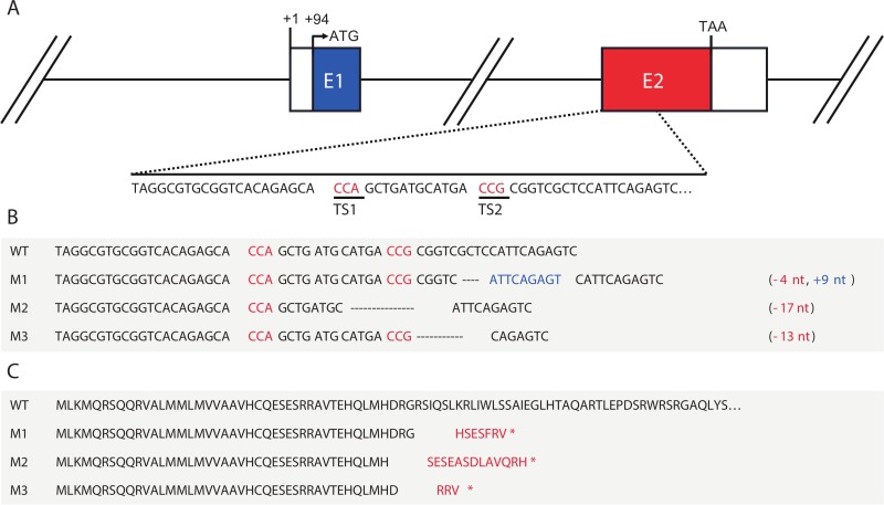Fig. 1 CRISPR/Cas9-induced mutations at the zebrafish pth4 locus. (A) Graphical representation of the pth4 gene. Coding exons are represented with colored boxes and the 5′-UTR and 3′UTR are represented as white boxes. (B) Nucleotide sequence of wild-type pth4 (WT) and induced mutations (M1, M2 and M3). The protospacer-adjacent motif (PAM) is indicated in red, denoting the mutation target sites (TS1 and TS2). Hyphens represent deletions and nucleotides in blue represent insertions. (C) Predicted amino acid sequences of wild-type pth4 and induced mutations. Amino acids in red differ from the WT sequence and asterisks indicate stop codons. (For interpretation of the references to color in this figure legend, the reader is referred to the web version of this article.)