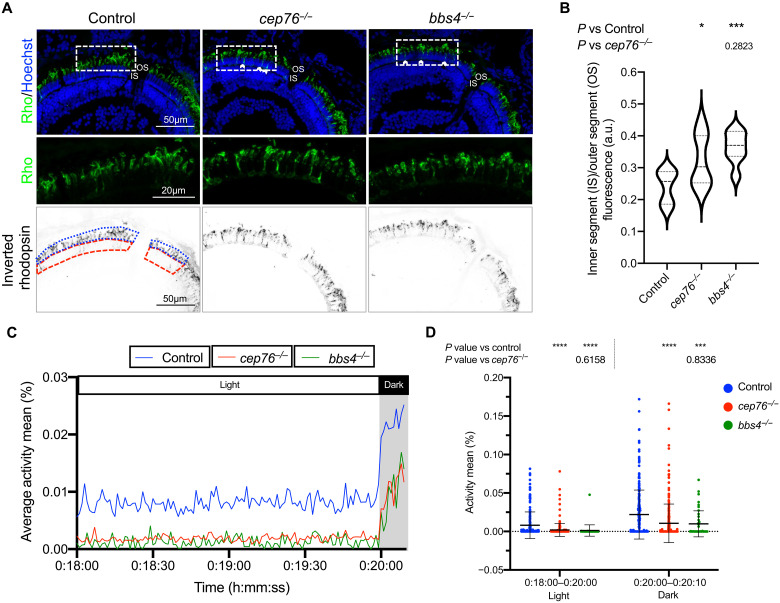 (A) Top row: Immunofluorescence staining on retinal cryosections derived from control, cep76−/−, and bss4−/− larvae at 5 dpf. Rhodopsin and nuclei are labeled in green and blue, respectively. Mislocalization of rhodopsin to the inner segment (IS) is demarcated by white arrowheads. Hoechst nuclear staining (blue) shows the cell bodies of rod cells and the barrier at which measurements were taken. Middle row: Zoomed images of white dashed box insets of the top panels with only rhodopsin staining shown. Bottom row: Inverted fluorescence images show rhodopsin staining only from the top panel images. Inner segment, bounded by the red dashed area; outer segment (OS), bounded by the purple dotted area. Panels of each row are scaled to the same magnification. (B) Quantitative analysis of rhodopsin mislocalization observed in retinal sections shown in (A) (bottom row of panels). Unpaired t test with Welch’s correction, *P < 0.05 and ***P < 0.001. Error bars represent standard deviation. n = 7 to 10 specimens per genotype; n = 2 to 4 sections per specimen. (C) The timed graph showing DanioVision locomotion assay in 5-dpf zebrafish larvae plots the average activity mean during 2 min of light followed by 10 s of dark. The representative cycle is shown. h, hours; mm, minutes; ss, seconds. (D) Cumulative activity mean of DanioVision locomotion assay data in light (2 min) and dark (10 s). Statistical significance was calculated using an unpaired t test with Welch’s correction. ****P < 0.0001 and ***P < 0.001. n = 24 to 48 fish per genotype.