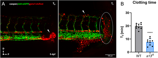 Fig. 3 Accelerated clotting in the absence of ADAMTS13. (A) Representative confocal images of a casper;kdrl:eGFP;gata1:dsRed zebrafish at 5 dpf at time 0 (T0) and at the final clotting time (Tf). (B) Quantification of the clotting time (Tf in minutes) in WT (grey) and a13i5 (blue) zebrafish larvae. Data are shown as means±s.d. Each dot represents a single embryo. ****P≤0.0001 by two-tailed Student's t-test. Scale bar: 100 µm.