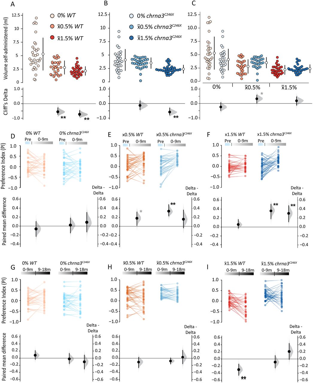 Fig. 3 chrna3 mutation dynamically alters relative preference for alcohol. A–C, Gardner–Altman and Cumming estimation plots comparing the volume of alcohol dispensed over the entire self-administration period during SAZA for A, WT (0/x̄0.5/x̄1.5%, n = 30/31/30); B, chrna3C246X (0/x̄0.5/x̄1.5%, n = 29/32/30); and C, intergenotype comparisons. Asterisks indicate the following significant differences from 0% alcohol treatments (A, B) or the WT (C), *padj < 0.05, and the effect size reported by Cliff's delta between ±0.2 and ±0.4 (provisional difference), **padj < 0.01 and effect size bigger than ±0.4 (meaningful difference). D–I, Paired mean difference of PI between D and F. Pre and 0–9 m or G–I, 0–9 and 9–18 m time periods within genotypes and delta–delta comparisons between genotypes, during D and G, 0%; E and H, x̄0.5%; and F and I, x̄1.5% SAZA. Asterisks indicate a significant paired mean difference, or delta–delta, between time periods: *p < 0.05 (provisional difference); **p < 0.01 (meaningful difference). See Table S2 for the exact effect size and p values.