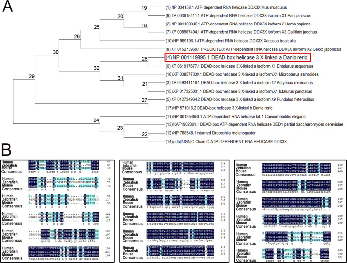 Phylogenetic tree and amino acid sequence analysis of DDX3X across species.