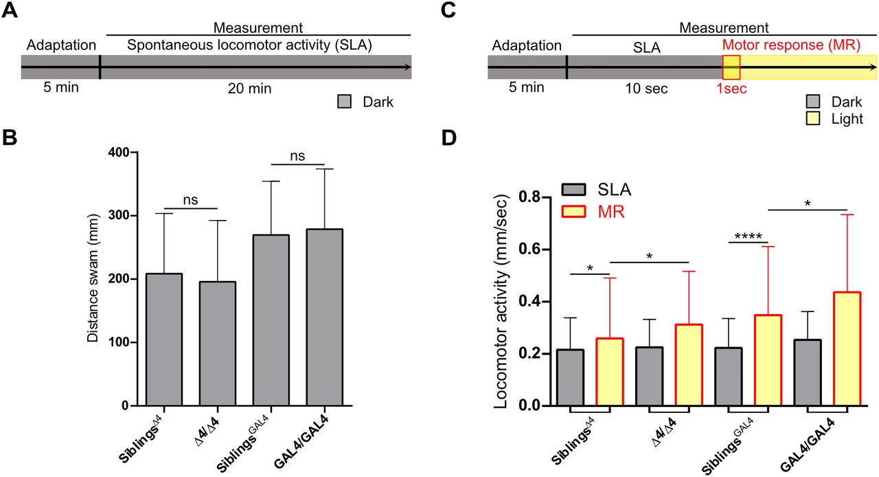 Fig. 8 Gpr85-KO impacts larval light-induced motor response. A, Schematic representation of the experimental setup for assessing spontaneous locomotor activity. B, Quantification of the distance swum by 6 dpf Gpr85-KO larvae compared with siblings over 20 min in the dark (gpr85Δ4/Δ4, n = 69 vs siblings, n = 210; p = 0.36; and gpr85GAL4/GAL4, n = 77, vs siblings, n = 190; p = 0.94; ns, not significant; M–W U tests). C, Schematic representation of the experimental setup for measuring light-induced motor responses. The motor response was recorded within the first second following light onset. D, The motor response was observed in controls as a significant increase in the distance swum following light onset (n = 210 siblings of gpr85Δ4/Δ4 mutants; dark vs motor response; *p = 0.02; n = 247 siblings of gpr85GAL4/GAL4 mutants, dark vs motor response; ****p < 0.0001; Wilcoxon matched-paired signed–rank tests). The motor response was significantly more pronounced in gpr85-deficient animals compared with controls (n = 80 gpr85Δ4/Δ4 mutants vs siblings; *p = 0.015; n = 83 gpr85GAL4/GAL4 mutants vs siblings, *p = 0.011; M–W U tests). SLA, spontaneous locomotor activity; SR, motor response. Data are presented as mean ± SD (B, D).