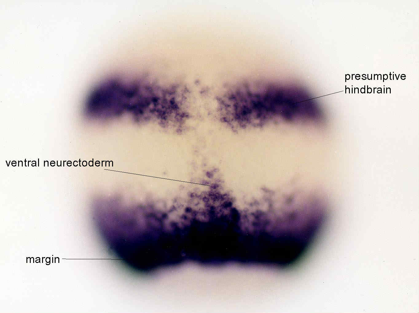 Fig. 2 At the onset of gastrulation the expression of Fgf8 disappears progressively from the ventral margin and increases in dorsal marginal cells establishing a dorsal to ventral gradient of expression. At 60% epiboly a weak expression is still observed in EVL cells that are now located vegetaly to the marginal cells. Dorsally a strong expression is observed in presumptive paraxial mesodermal cell and in the deepest cells of the epiblast in direct contact with the involuted mesoderm. At mid-gastrulation, in addition to the marginal EVL and the embryo margin a novel site of expression appears in the presumptive hindbrain and the underlying cephalic paraxial mesoderm. A strong expression is also observed in ventral neurectoderm (presumptive floor plate). Expression of Fgf8 increases in presumptive hindbrain and disappears from paraxial cephalic mesoderm at late gastrula. Near the margin expression is strong in presumptive neurectodermis as well as in dorsal marginal cells (that give rise to axial structures).
