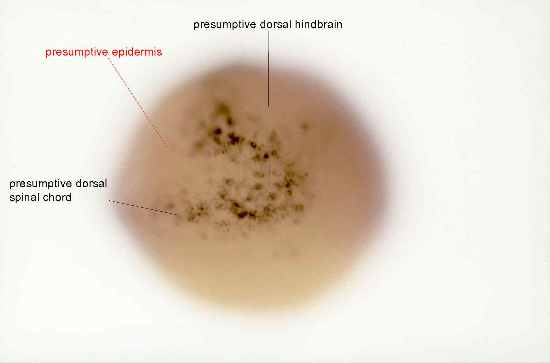 Fig. 1 First expression is observed at 70% epiboly in dorsal neural plate, in territory lining the presumptive epidermis from the animal pole to the ventral territory near the margin (a territory which corresponds to the presumptive dorsal spinal cord). Ventral proneural clusters appear later (80% epiboly) first near the margin in a territory corresponding to the ventral spinal cord. At the same developmental stage, strong expression is observed at the level of the presumptive midbrain.