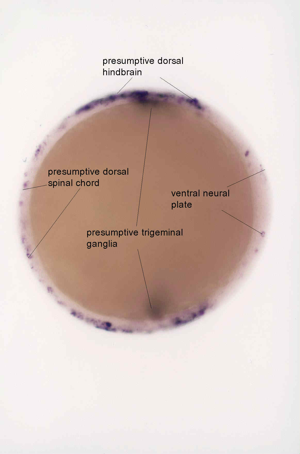 Fig. 1 First expression is observed at 70% epiboly in dorsal neural plate, in territory lining the presumptive epidermis from the animal pole to the ventral territory near the margin (a territory which corresponds to the presumptive dorsal spinal cord). Ventral proneural clusters appear later (80% epiboly) first near the margin in a territory corresponding to the ventral spinal cord. At the same developmental stage, strong expression is observed at the level of the presumptive midbrain.