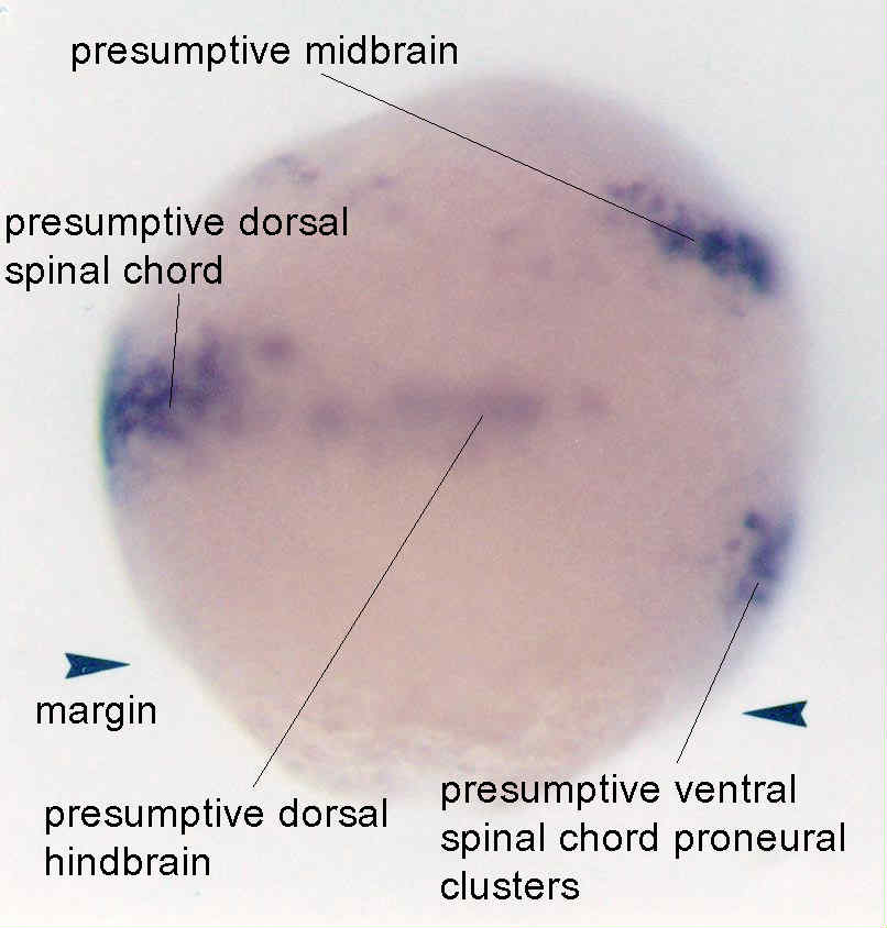 Fig. 1 First expression is observed at 70% epiboly in dorsal neural plate, in territory lining the presumptive epidermis from the animal pole to the ventral territory near the margin (a territory which corresponds to the presumptive dorsal spinal cord). Ventral proneural clusters appear later (80% epiboly) first near the margin in a territory corresponding to the ventral spinal cord. At the same developmental stage, strong expression is observed at the level of the presumptive midbrain.