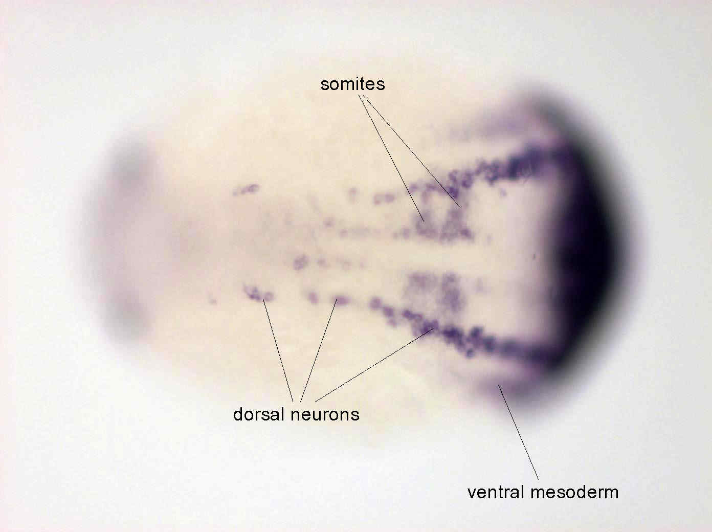 Fig. 2 Expressed in dorsal neural plate neurons, at the posterior neural plate border, in somites, at the midbrain-hindbrain boundary, in trigeminal placode. Also expressed in posterior region, in posterior most notochord, posterior unsegmented paraxial mesoderm, posterior ventral mesoderm but not in tail bud