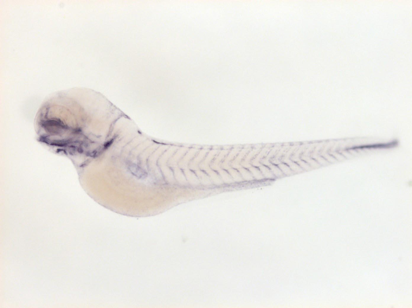 Please note that in 5 day old embryos some structures are not accessible to the probe (such as notochord, most of the trunk and tail). Therefore the description of the expression pattern is only partial.
