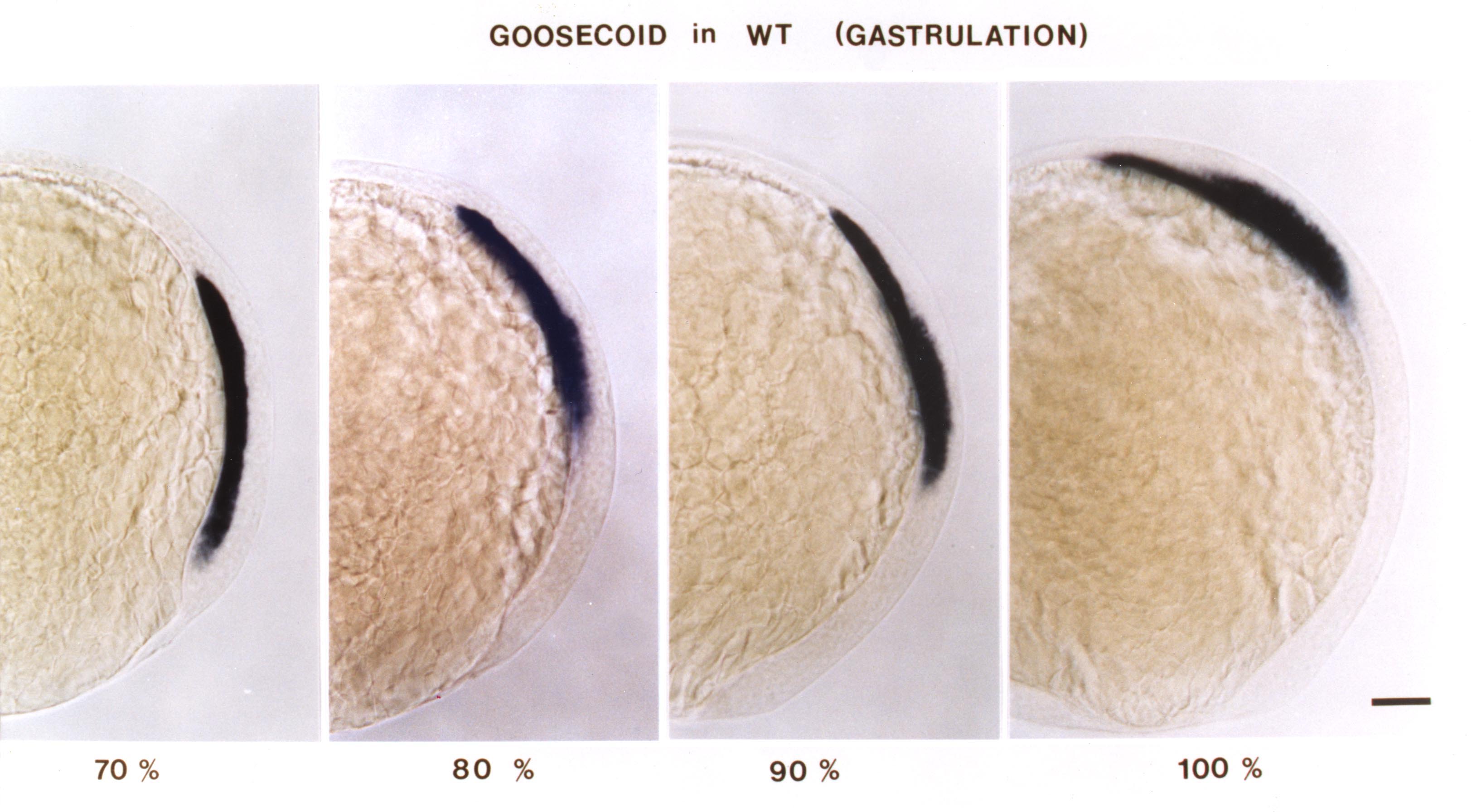 Fig. 2 Expression is observed from shield to 60% epiboly in prechordal plate mesoderm. At 70% expression is maintained in prechordal plate and starts in ventral neurectoderm. From 80 to 100% epiboly expression is strong in prechordal plate and in ventral neurectoderm (presumptive ventral diencephalon. At the end of gastrulation expression is also observed in presumptive telencephalon (anterior edge of the neural plate).