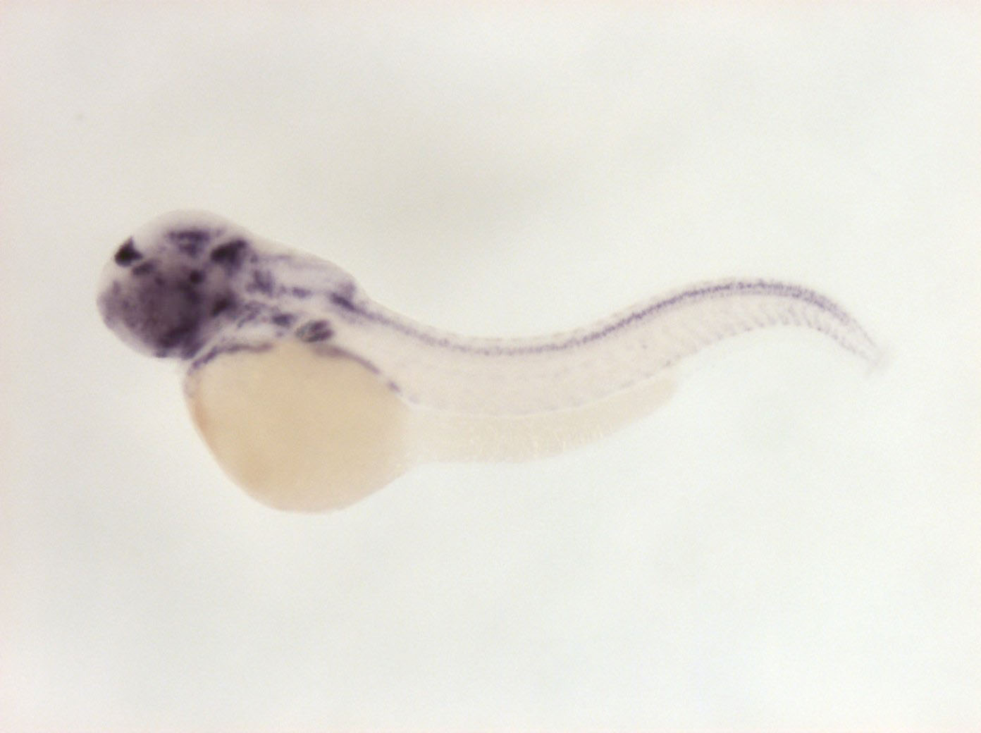 Fig. 6 nose, epiphysis, ventral posterior tegmentum, dorsal cerebellum, dorsal hindbrain, cranial ganglia, nuclei in ventral hindbrain, ventral part of retina, habenula (left, very weak expression on right side), hypaxial part of anterior somites, spinal chord neurons, retina intermediate cell layer, pectoral fin muscles, hypaxial muscles