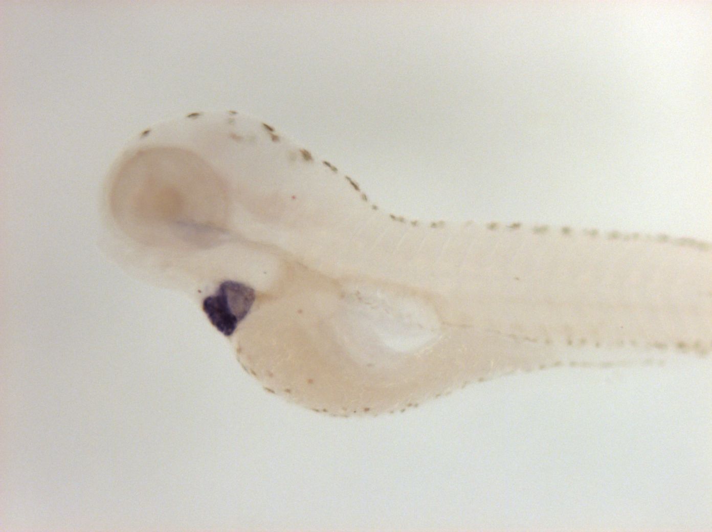 Please note that in 5 day old embryos some structures are not accessible to the probe (such as notochord, most of the trunk and tail). Therefore the description of the expression pattern is only partial.