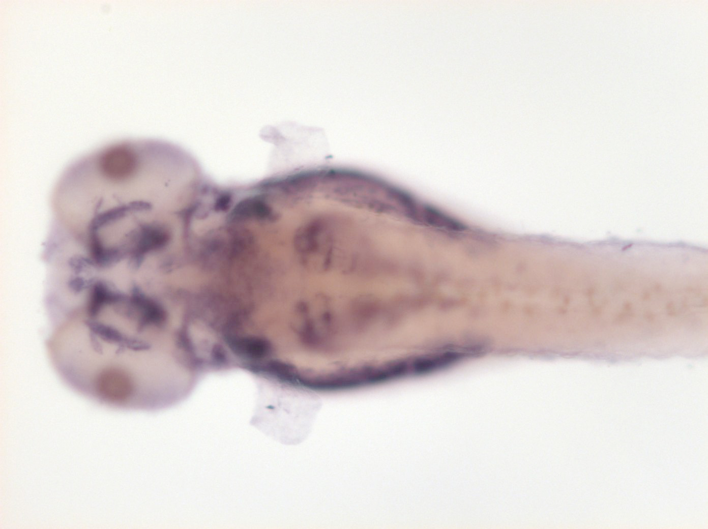 Please note that in 5 day old embryos some structures are not accessible to the probe (such as notochord, most of the trunk and tail). Therefore the description of the expression pattern is only partial.