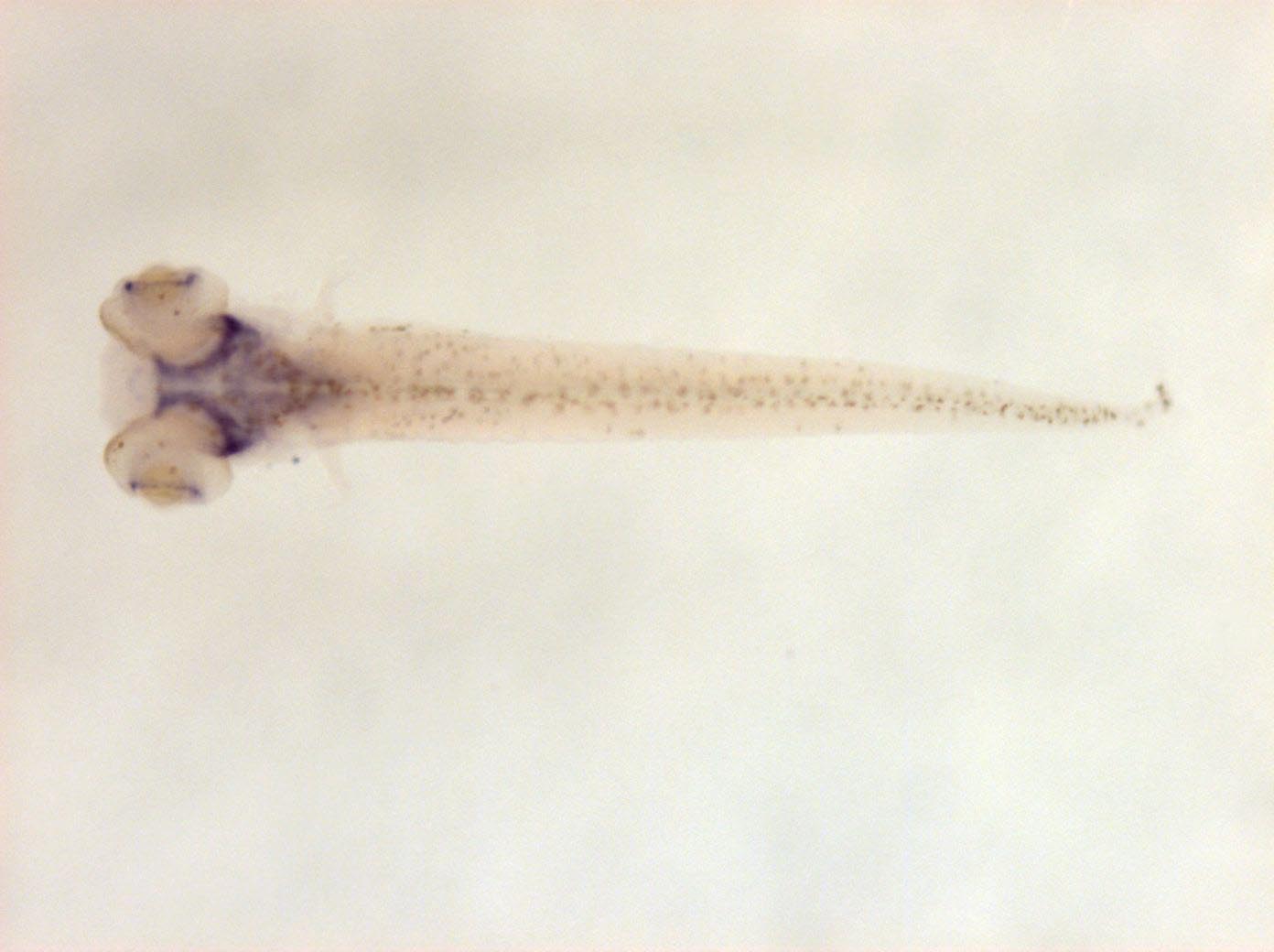 Please note that in 5 day old embryos some structures are not accessible to the probe (such as notochord, most of the trunk and tail). Therefore the description of the expression pattern is only partial.