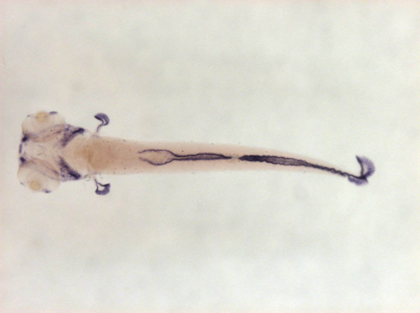 Please note that in 5 day old embryos some structures are not accessible to the probe (such as notochord, most of the trunk and tail). Therefore the description of the expression pattern is only partial.
