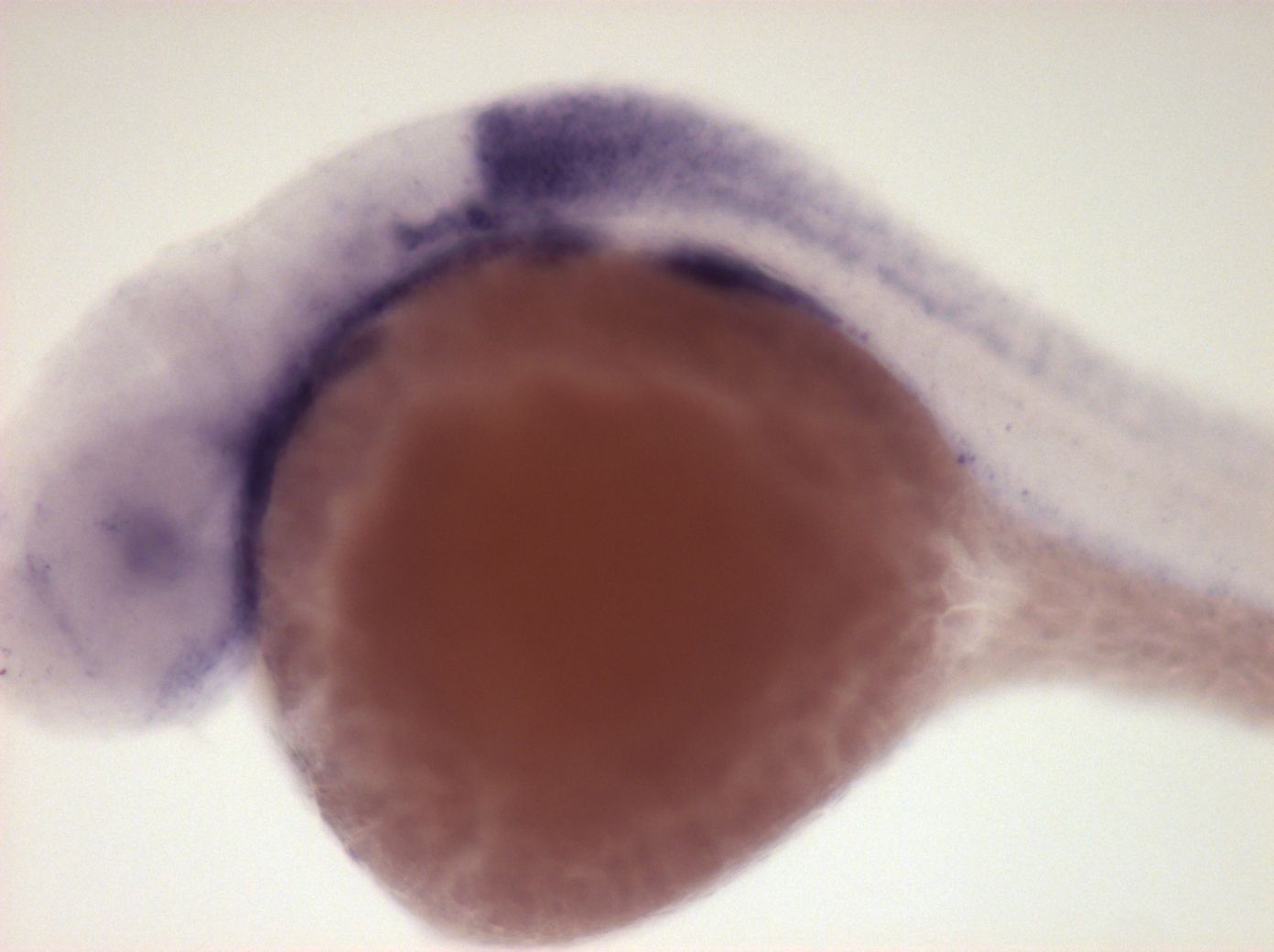 Fig. 4 branchial arches, branchio motor neurons, anterior spinal chord, hypaxial muscles (precursors of pectoral fin muscles), ventral mesenchyme, tail bud, posterior spinal chord, ventral mesoderm, anus, habenula, lens?, cornea?