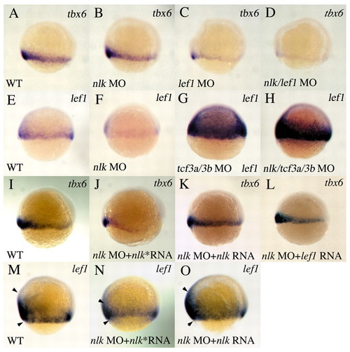 nlk and lef1 cooperatively regulate tbx6, and nlk regulates lef1 expression. (A-D) tbx6 expression at 60% epiboly, lateral view, dorsal to the right. A low dose (0.6 ng) of nlk MO has no effect on tbx6 expression (B, compare with wild type in A). 1 ng lef1 MO reduces tbx6 expression (C), and this effect is enhanced by co-injection of 0.6 ng nlk MO (D). (E-H) Expression of lef1 at shield stage, lateral view, dorsal to the right. lef1 is expressed at the margin in wild type (E), but is reduced in nlk MO (F). lef1 expression is dramatically elevated in tcf3a/tcf3b morphants (G) and in nlk/tcf3a/tcf3b MO embryos (H). (I-L) nlk or lef1 RNA rescues tbx6 expression in nlk morphants. nlk* RNA refers to the C387Y mutant. Co-injection of 200pg nlk RNA (K), but not nlk* RNA (J), restores tbx6 expression to levels similar to wild type (I). 100pg lef1 RNA (L) also rescues nlk morphants. Similarly, nlk RNA rescues normal lef1 expression (O, compare with wild type in M; arrowheads delineate the expression domain), whereas nlk* RNA (N) does not. |