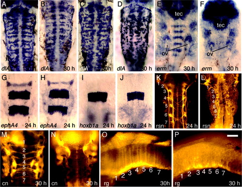 Hindbrain development in val mutants. All embryos are val homozygous mutants. A: wnt1 expression at 27 hours postfertilization (hpf). B: dlA expression at 30 hpf. C: Two-color in situ hybridization, showing wnt1 (black) and dlA (Fast Red fluorescence) on the left side of the hindbrain at 30 hpf. D: erm expression at 30 hpf. The position of the otic vesicles (ov) is indicated. E: Commissural neurons (cn) labeled with zn8 antibody at 30 hpf. The number and positions of commissural axons is highly variable in the posterior hindbrain. Note that the right side of the r5/6 region has only a single commissure (c), which is not in register with the two commissures on the left. F: Reticulospinal neurons (rsn) labeled with anti-acetylated tubulin at 24 hpf. G: Radial glia labeled with zrf1-4 antibodies at 30 hpf. All images show dorsal views with anterior to the top except for G, which shows a lateral view with anterior to the left. Numbers indicate corresponding rhombomeres. Scale bar in G = 50 μm in C,G, 70 μm in E, 90 μm in F, 120 μm in A,B,D. |