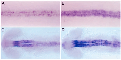 Inactivation of Cos2 function induces ectopic Hh signalling in the ventral neural tube. (A) fkd4 expression in the ventral neural tube (MFP and LFP cells) of a 22-somite stage wild-type embryo. (B) Upregulation of the levels and expansion in the domain of fkd4 expression in the ventral neural tube of a 22-somite stage cos2 morphant (n=16/22). (C) Expression pattern of fkd4 in ventral cell populations of the developing mid- and hindbrain of a 22-somite stage wild-type embryo. (D) Increased levels and enlargement of the domain of fkd4 in ventral cell populations of the developing mid- and hindbrain of a 22-somite stage cos2 morphant embryo (n=13/22). EXPRESSION / LABELING:
