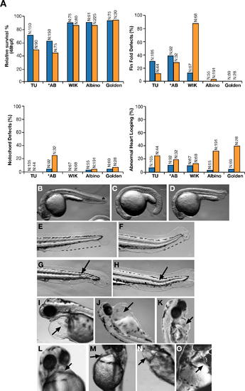Developmental Defects Observed among WT Strains after Decreasing Hsp90 Function at 30% Epiboly (A) Frequencies: Embryos were treated at 30% epiboly with 10 μM radicicol (blue) or 3.3 μM 17AAG (orange). Rate of survival is the relative percentage of live embryos at 48 hpf compared to the relevant control siblings. Abnormal heart looping includes heterotaxia and nonlooping of the heart tube; severely oedematous fish with consequently abnormal heart were excluded. (B–O) Examples of observed phenotypes: (B–D) Developmental delay observed at 24 hpf after treatments. Interrupted caudal fin fold (dotted lines) after radicicol (E) or 17AAG (F) treatment. Notochord folds (arrows) after radicicol (G) and 17AAG (H). Drug-induced heart oedema with abnormal heart morphology after radicicol (I) and 17AAG (J). Radicicol-induced mild oedema with abnormal heart looping (K). WT (L) or inverted heart looping after 17AAG (M), radicicol (N), or Hsp90 morpholino injections (O). Black arrows indicate the position of the ventricle. |