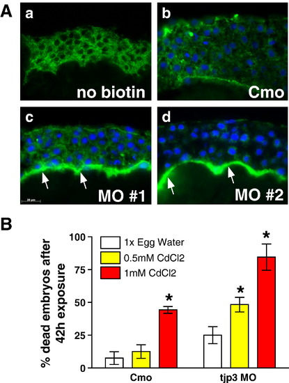 Tjp3/Zo-3 is essential for EVL permeability barrier function. (A) Biotin permeability assay: negative control without biotin (a), control morpholino (b) and tjp3/zo-3 morpholino (c, d) injected embryos were dechorionized at 6 hpf and exposed to 1 mg/ml Biotin in egg water. Cryosections were probed with labeled streptavidin and images taken using identical parameters. In Cmo injected embryos, although some background staining for streptavidin was observed (a), only little biotin diffusion was detected (b). In 40% of the tjp3/zo-3 morpholino injected embryos, a significant accumulation of biotin was observed in the segmentation cavity between the blastoderm and the yolk syncytial layer (c, d, arrows), demonstrating a compromised epidermal barrier in embryos lacking Tjp3/Zo-3. (B) Morphant embryos are more sensitive to the toxic heavy metal cadmium as compared to control embryos. Embryos injected with either control morpholino (Cmo) or tjp3/zo-3 splice morpholino (MO) were dechorionized at 6 hpf and grown in 1x egg water as a negative control or in egg water containing 0.5 mM CdCl2 or 1 mM CdCl2. Significance of differences was established using 2-way analysis of variance. Cmo embryos had a mortality of ∼ 20% after 42 h exposure to low toxicity CdCl2, whereas the mortality of morphants was significantly higher at ∼ 50% (p < 0.01). At the high cadmium toxicity, Cmo embryos had ∼ 50% mortality and mortality of MO injected embryos was again significantly higher at ∼ 80% (p < 0.05). Mean and standard error (S.E.M.); n ≥ 20 per experiment; 3–4 independent experiments. 2-way ANOVA; p < 0.01. Asterisks indicate statistical significance. |
