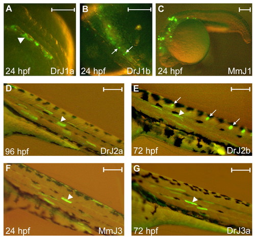 Enhancer activity of individual Hoxb5 non-coding elements in transgenic zebrafish. (A-G) Lateral views, anterior to the left. Arrows in B and E indicate cells of the developing CNS. Arrowheads indicate somites in A and muscle cells in D-G. The name and origin of each regulatory element are indicated as in Fig. 7. Age, in hpf, is indicated. Scale bars: 500 μm. |